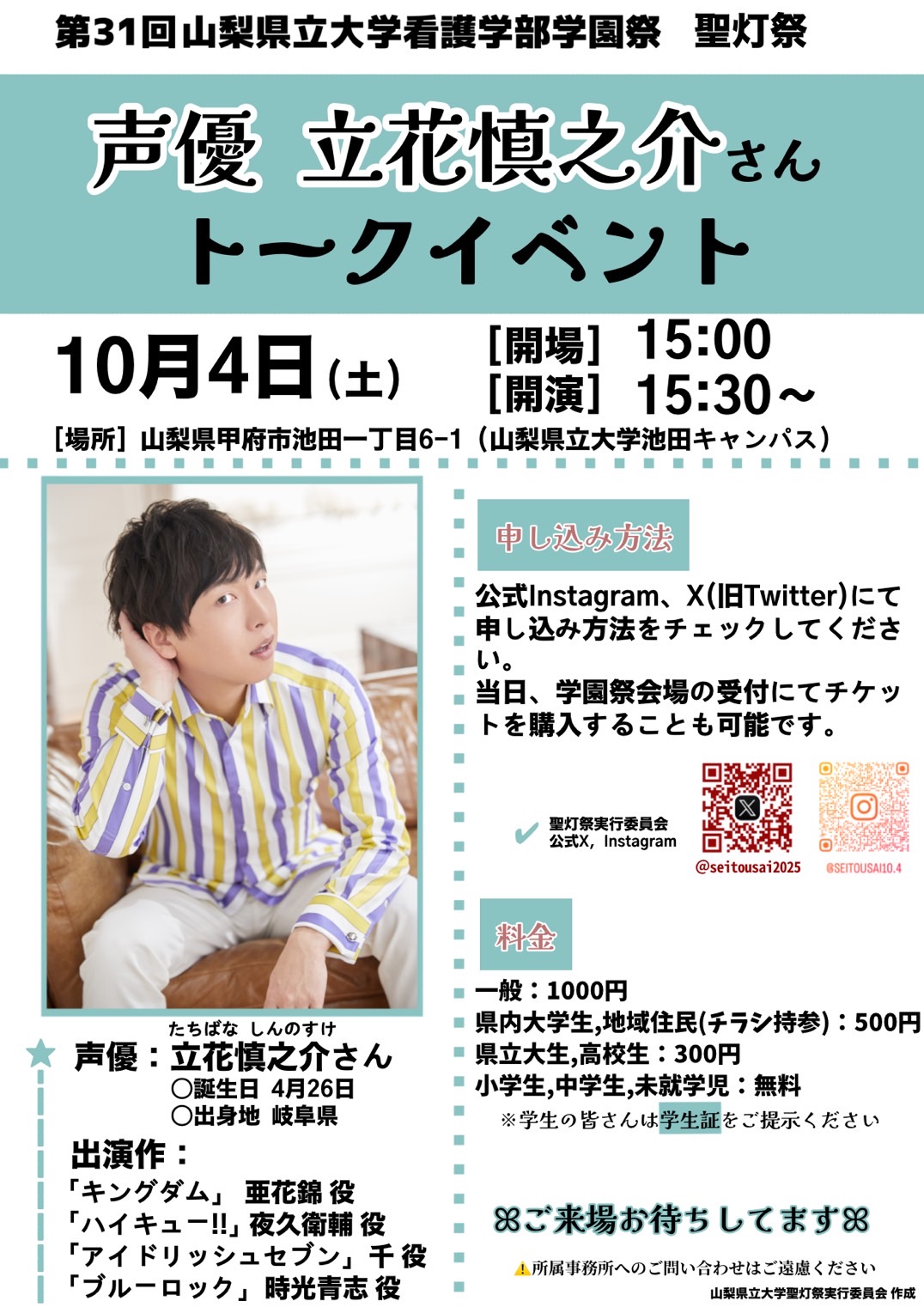 10月4日(土)に開催される、山梨県立大学池田キャンパス学園祭「聖灯祭」についてお知らせいたします。