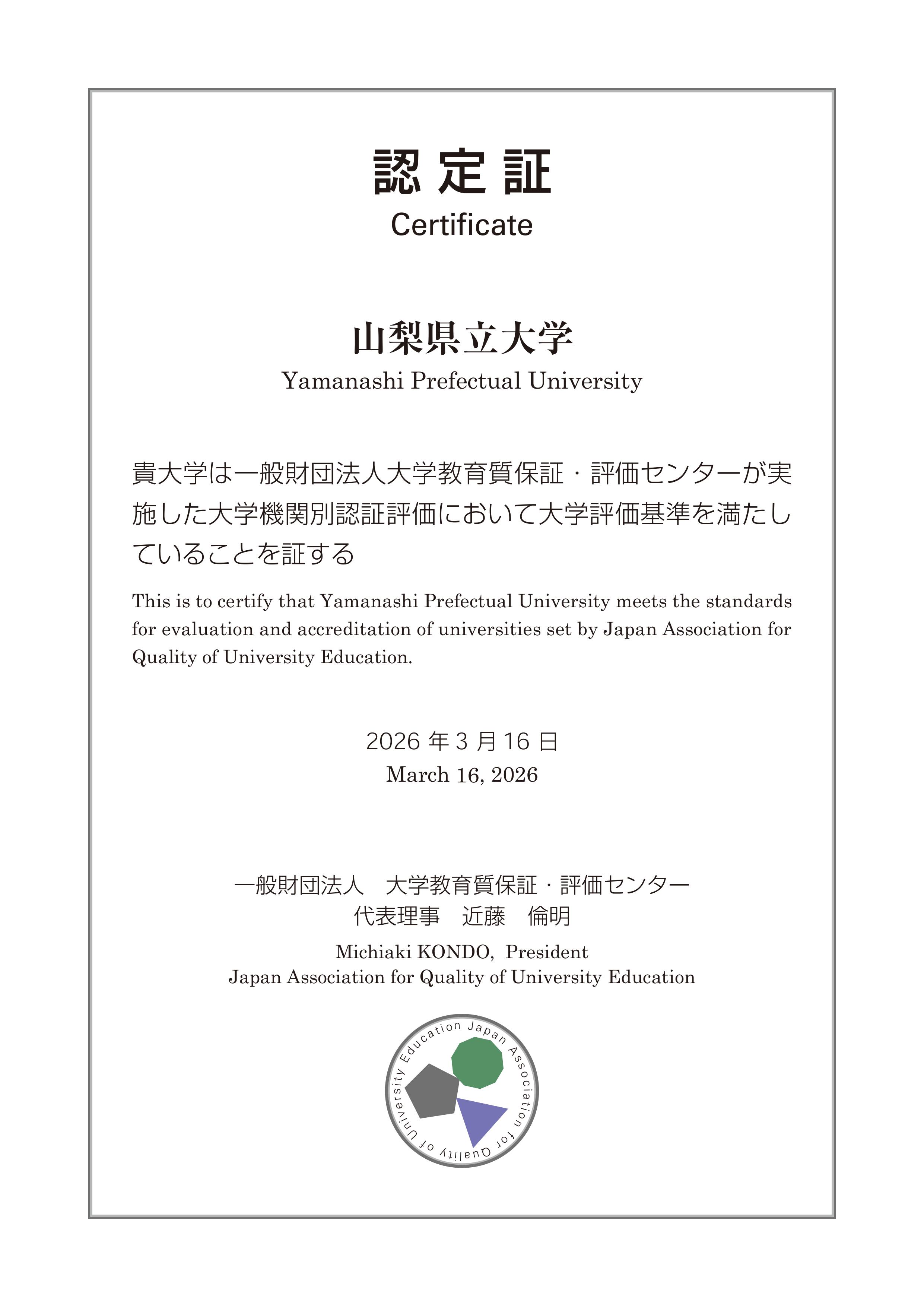 山梨県立大学は令和7年度に一般社団法人大学教育質保証・評価センターが実施する認証評価を受け、令和8年3月16日付で同センターが定める大学評価基準を満たしていると「認定」されました。