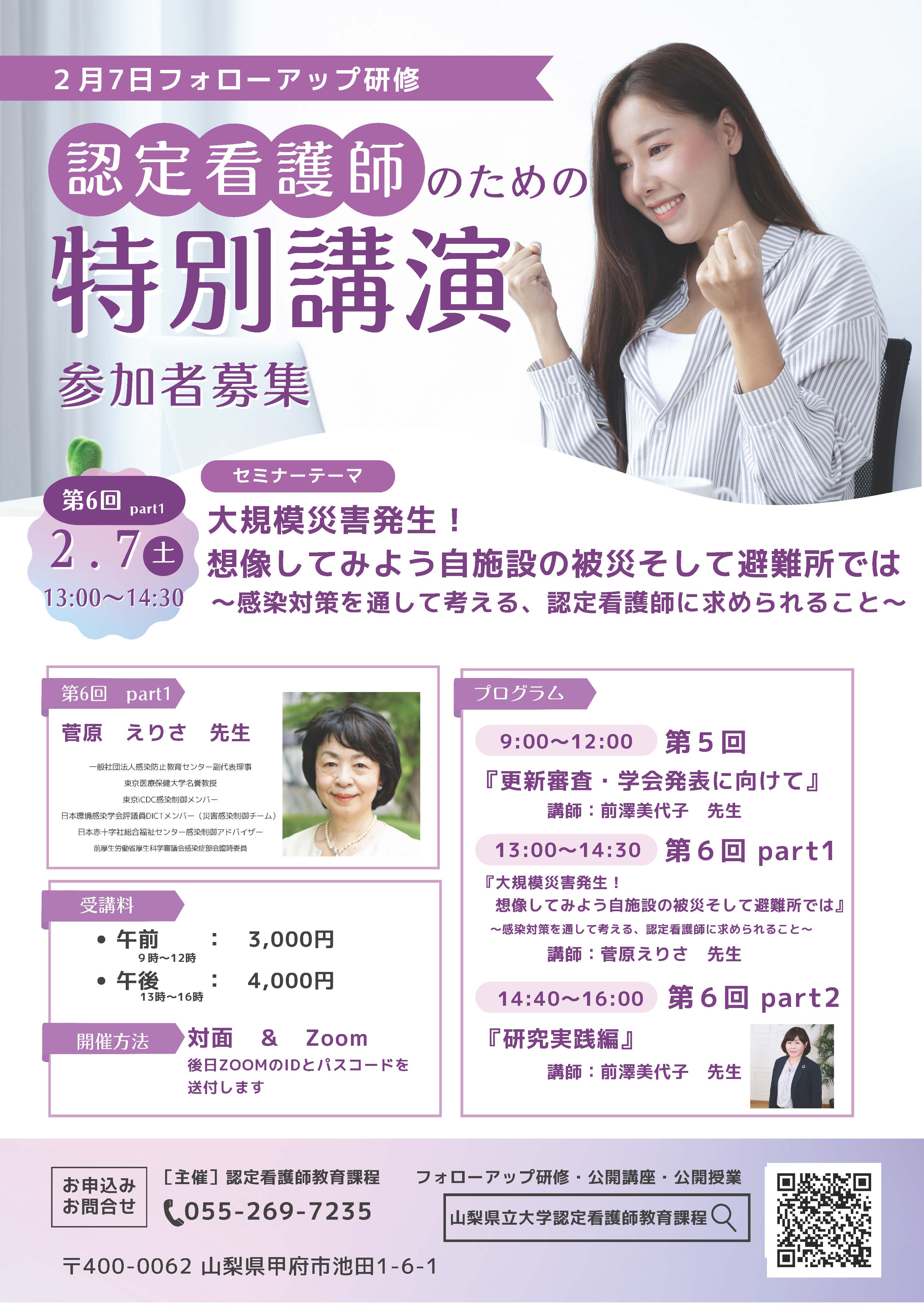 | プログラム | 【第5回】9:00~12:00 更新審査・学会発表に向けて 山梨県立大学 認定看護師教育課程 課程長 がん看護専門看護師 前澤 美代子 教授 【第6回】13:00~16:00 Part1 13:00~14:30 大規模災害発生!想像してみよう自施設の被災そして避難所では ~感染対策を通して考える、認定看護師に求められること~ 一般社団法人感染防止教育センター 副代表理事 東京医療保健大学 名誉教授 菅原 えりさ 先生 Part2 14:40~16:00 研究実践編 山梨県立大学 認定看護師教育課程 課程長 がん看護専門看護師 前澤 美代子 教授 |