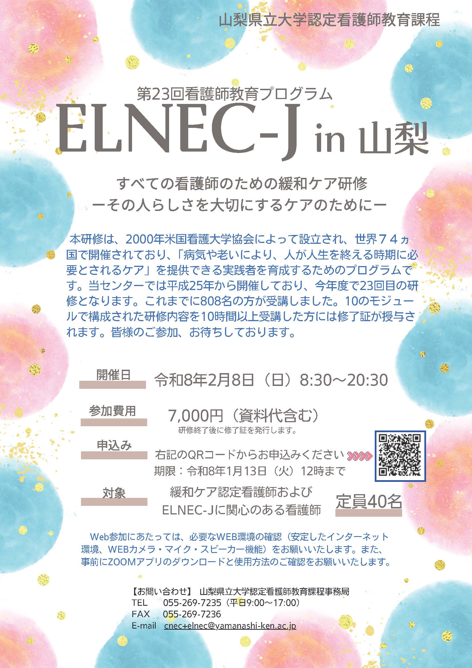 | お問合せ先 | 山梨県立大学 認定看護師教育課程事務局 TEL:055-269-7235(平日9:00~17:00) FAX:055-269-7236 E-mail:cnec+elnec@yamanashi-ken.ac.jp |