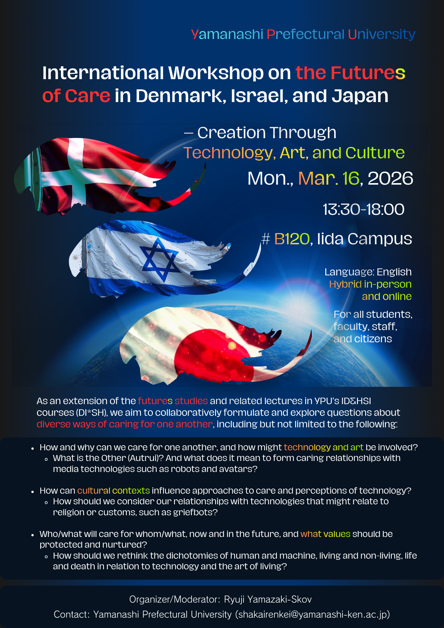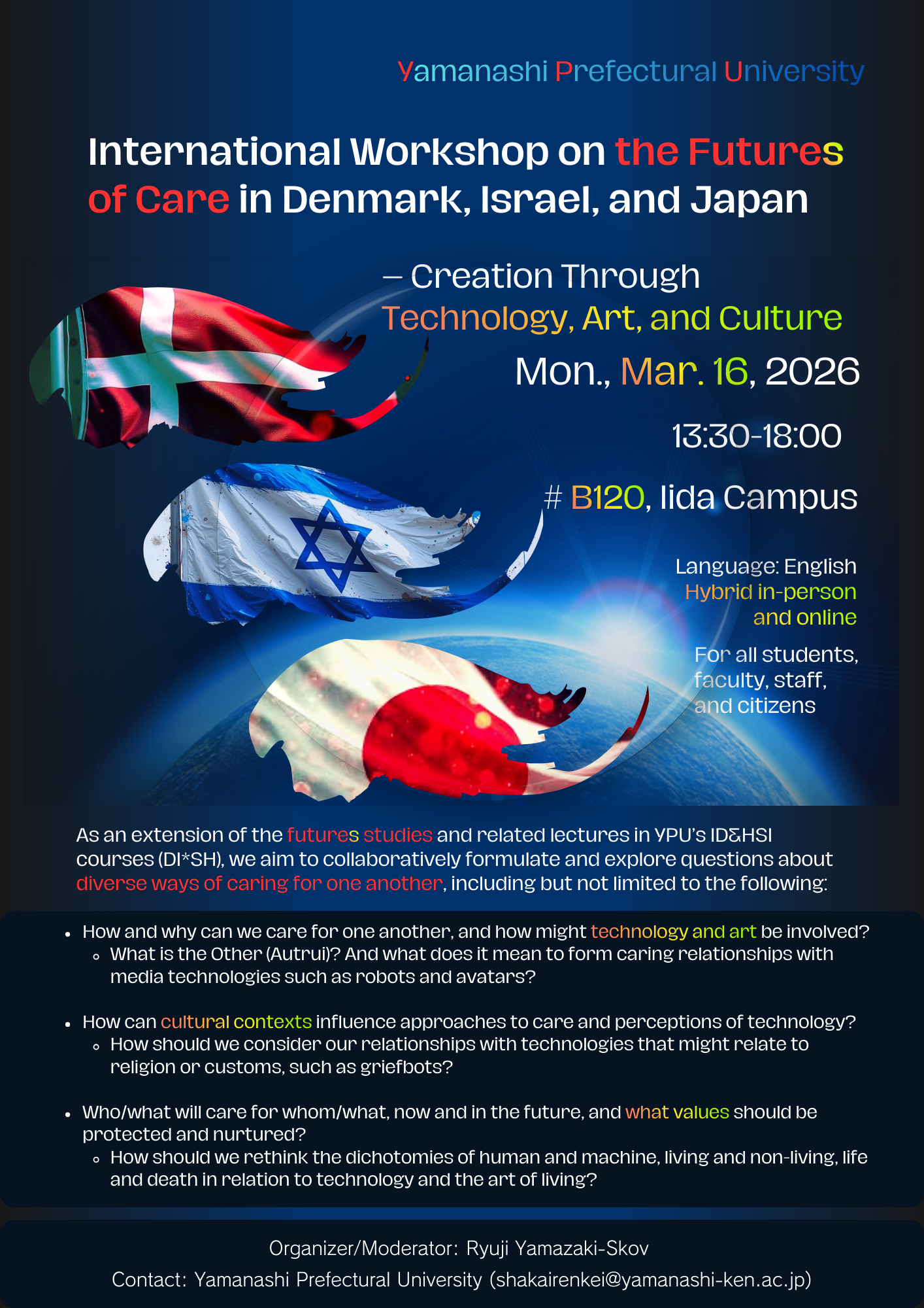 The rapid advancement of modern science and technology is transforming our living environments and relationships in diverse and accelerating ways. Even in areas of strength for Yamanashi Prefectural University (YPU)—nursing, welfare, caregiving, childcare, and education—AI, avatars, and robots are now entering the scenes. We have entered an era where humans coexist and collaborate with these new entities. This international workshop, themed “The Future of Care,” will discuss approaches based on practices and research from YPU and around the world. Furthermore, we will explore multifaceted ways to engage with future science and technology, while also paying attention to backgrounds across different linguistic and cultural spheres.