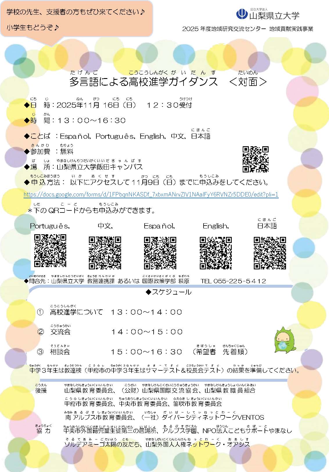 協力 | 中央市外国籍児童生徒第三の居場所、アルプス学園、NPO法人こどもサポートやまなし、ソルデアミーゴ太陽の友だち、山梨外国人人権ネットワーク・オアシス |