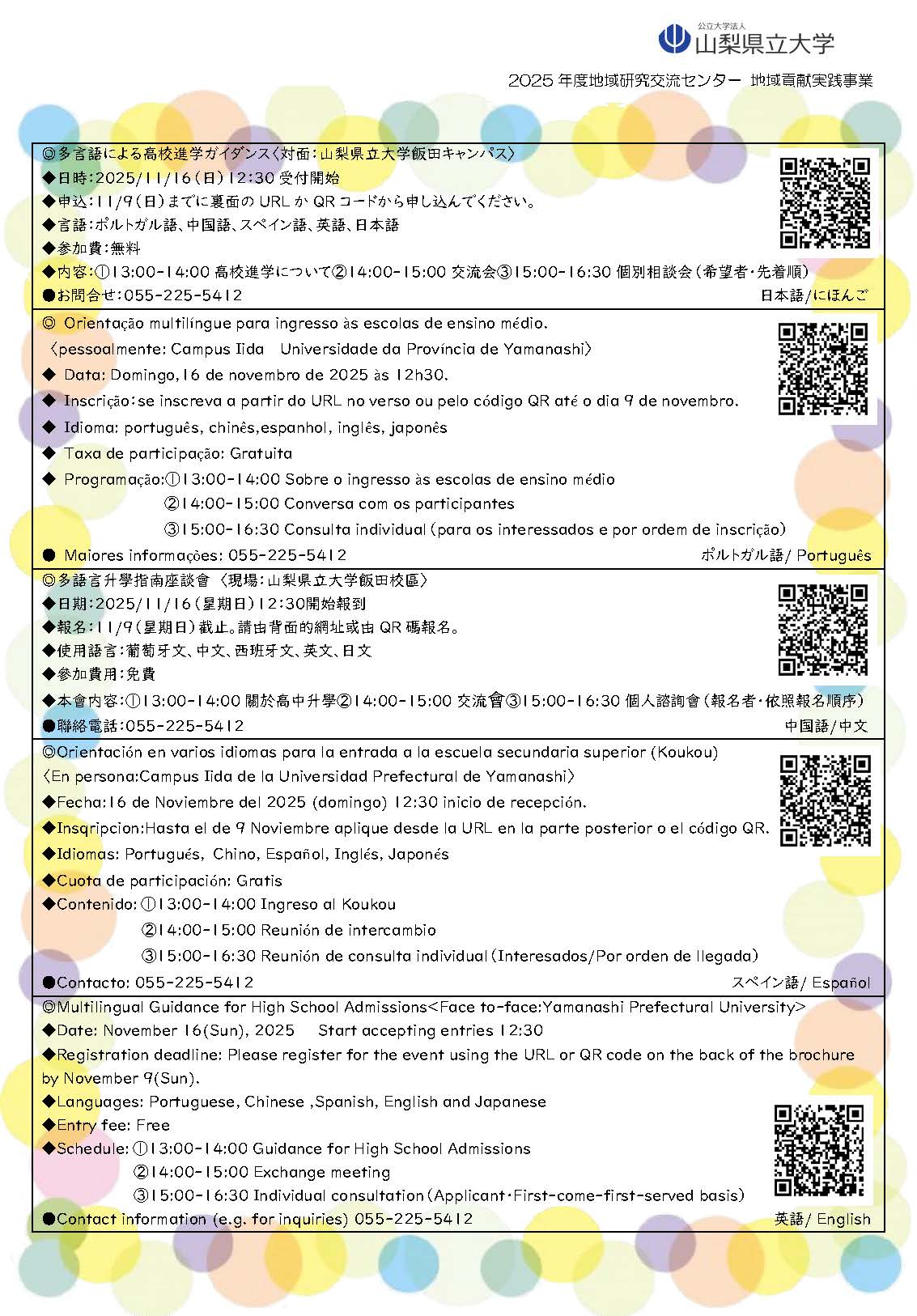 地域研究交流センターで実施している令和7年度地域貢献事業(地域実践)『「やさしい日本語」プロジェクト―街中にある“わかりにくい日本語”を見つけてみよう―』活動の一環として、下記のとおり「多言語による高校進学ガイダンス〈対面〉」を開催いたします。