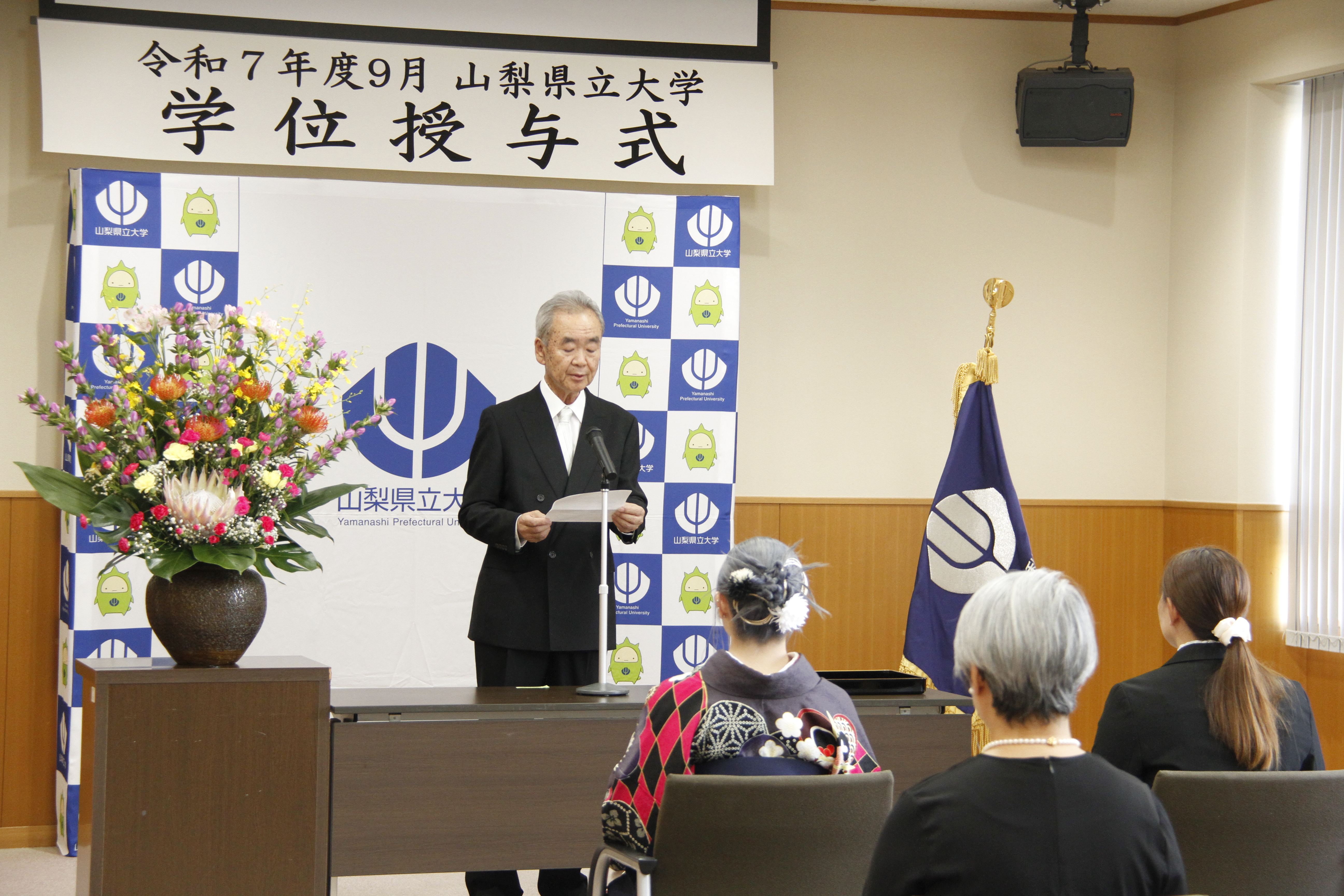 令和7年度9月山梨県立大学学位授与式が9月30日、飯田キャンパスで挙行され、学生2名が学び舎を巣立ちました。