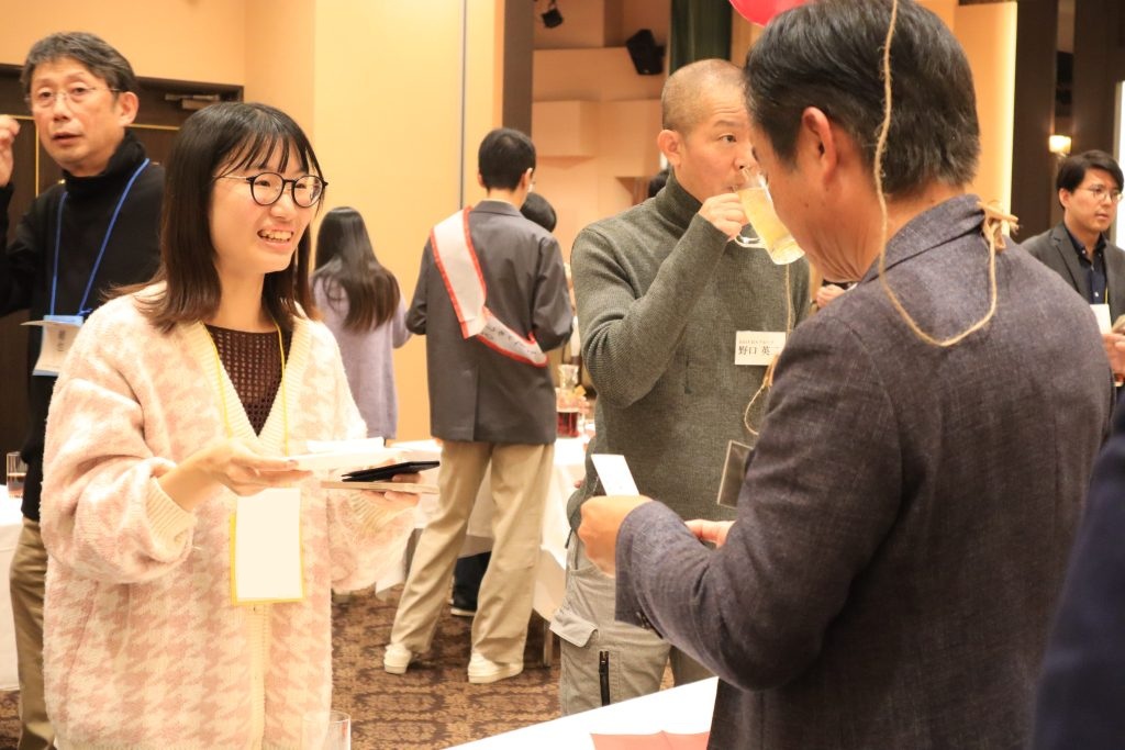 …発表者や県内企業の経営者たちとビュッフェスタイルで食事をしながら交流会