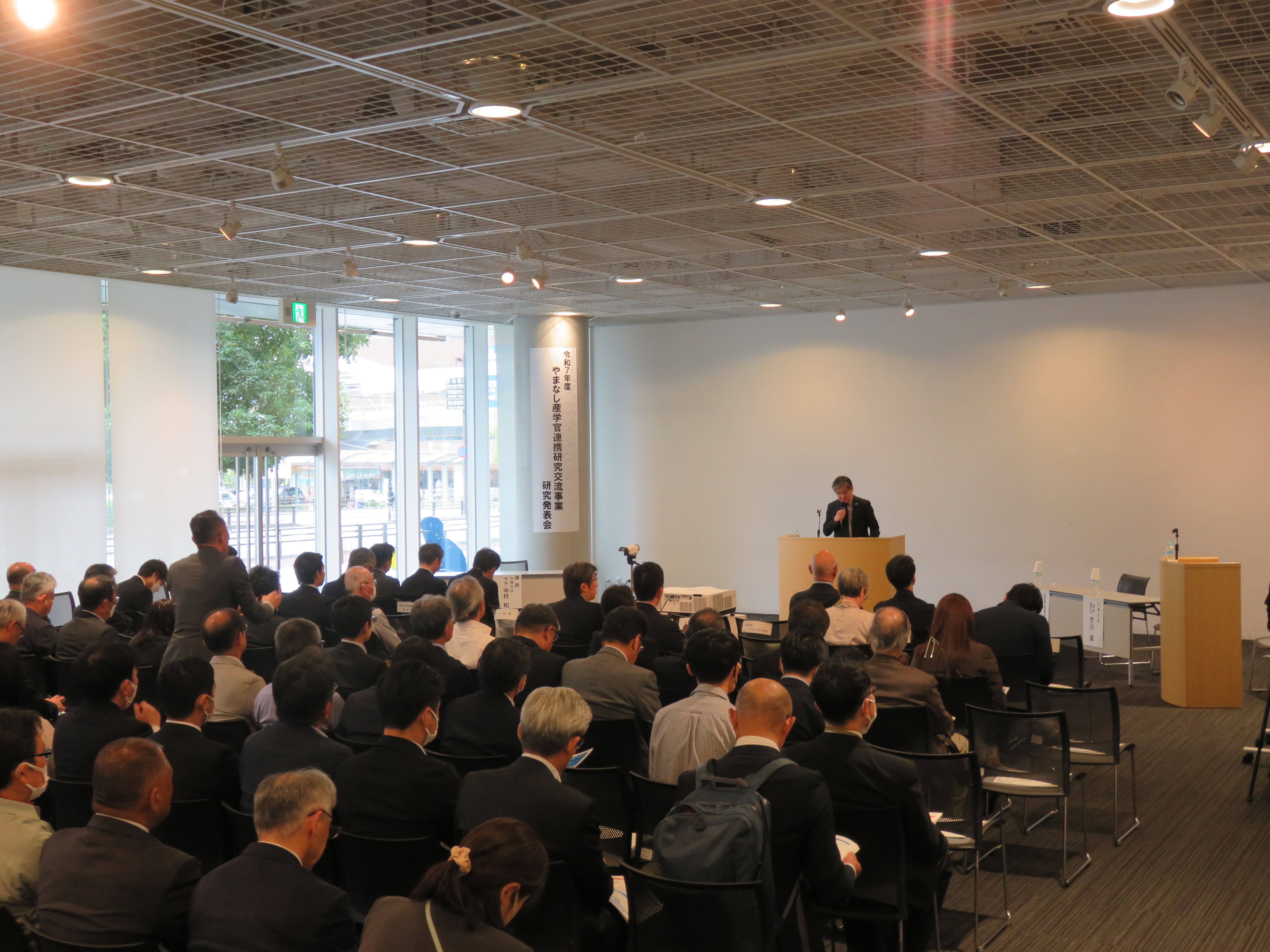 本発表会は、地域社会の課題解決と産業振興を目指し、大学の研究シーズと企業・行政のニーズをマッチングさせることを目的とし、山梨県と山梨大学が共催で実施されました。今年度は本学が特別参加として参画し、産学官の連携強化を図りました。