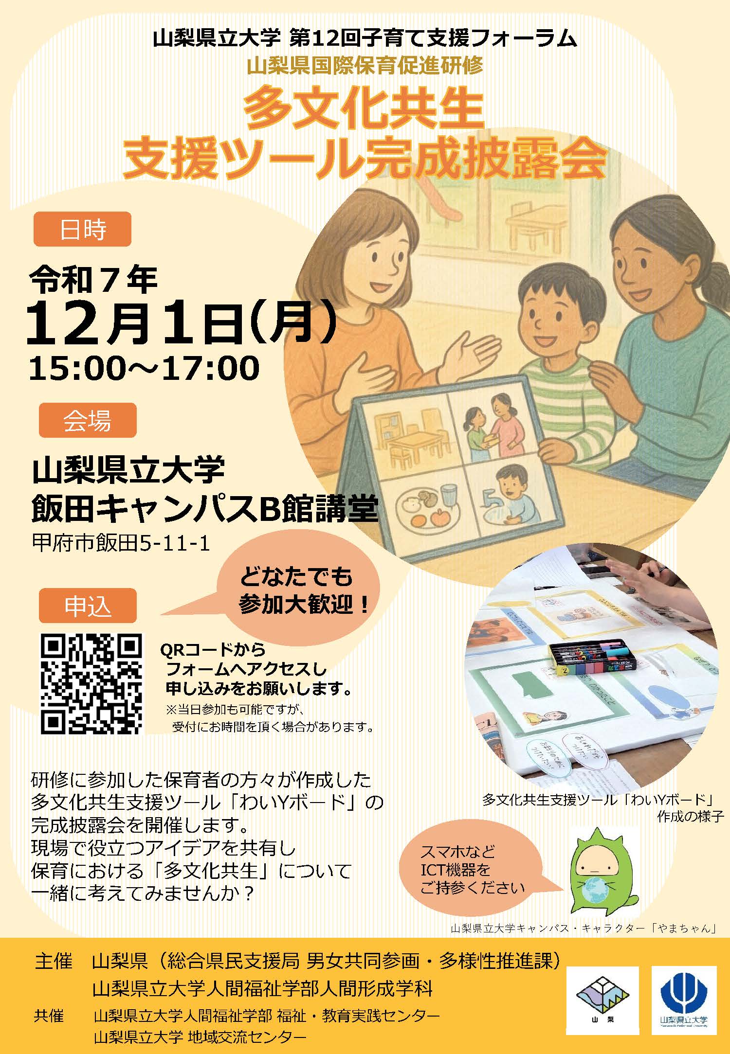 今回の子育て支援フォーラムは、山梨県総合県民支援局男女共同参画・多様性推進課と共催で、保育の現場や保育を学ぶ学生に多文化共生保育について考える機会を提供することを目的として、山梨県国際保育推進研修において保育者と作成した「多文化共生保育支援ツール」の完成披露や座談会を行います。