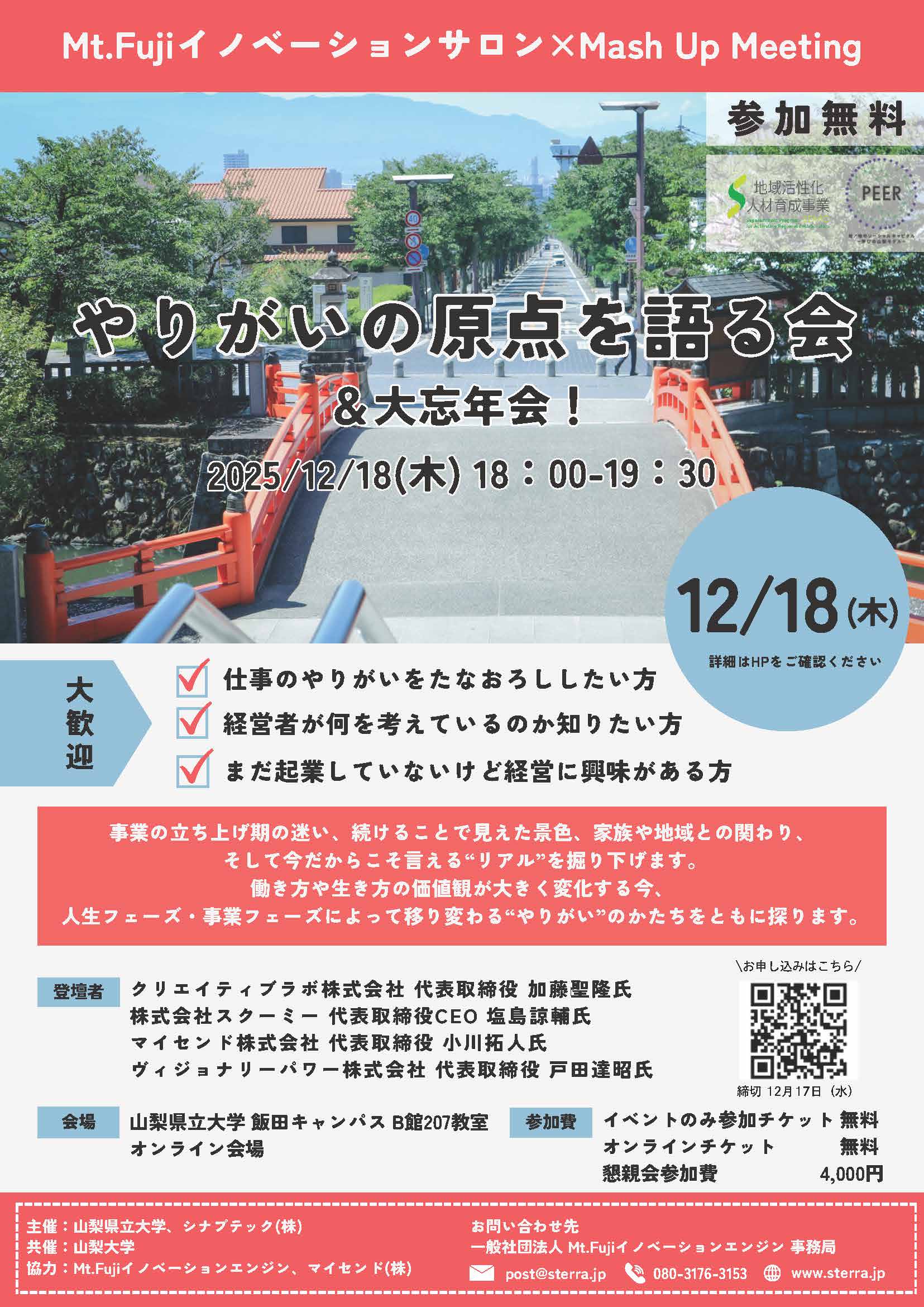 このイベントは、山梨県立大学と一般社団法人Mt.Fujiイノベーションエンジンが協働して行う、学びを通して社会とつながるイベントです。