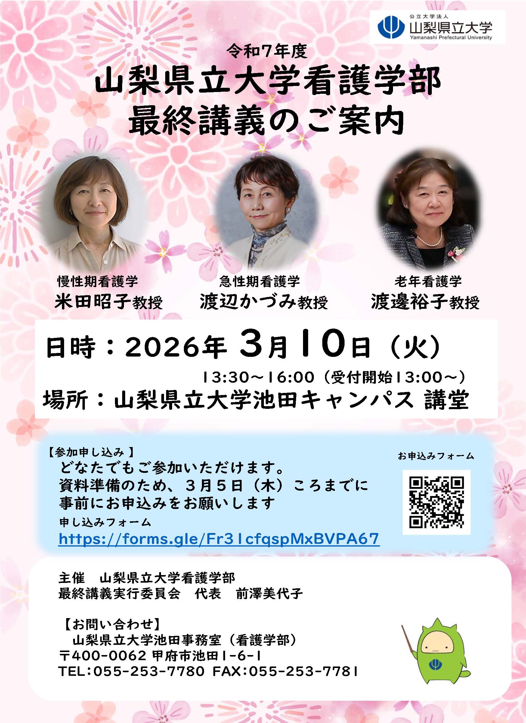 このたび看護学部において、長きにわたり本学の看護教育に御尽力されました米田昭子教授(慢性期看護学)、渡辺かづみ教授(急性期看護学)、渡邊裕子教授(老年看護学)の3名の先生方が令和 8年3月31日をもって定年退職されることになり、令和8年3月10日(火)13:30~16:00 池田キャンパス講堂にて最終講義を行うこととなりました。是非とも多くの方のご出席を賜りますようお願い申し上げます。