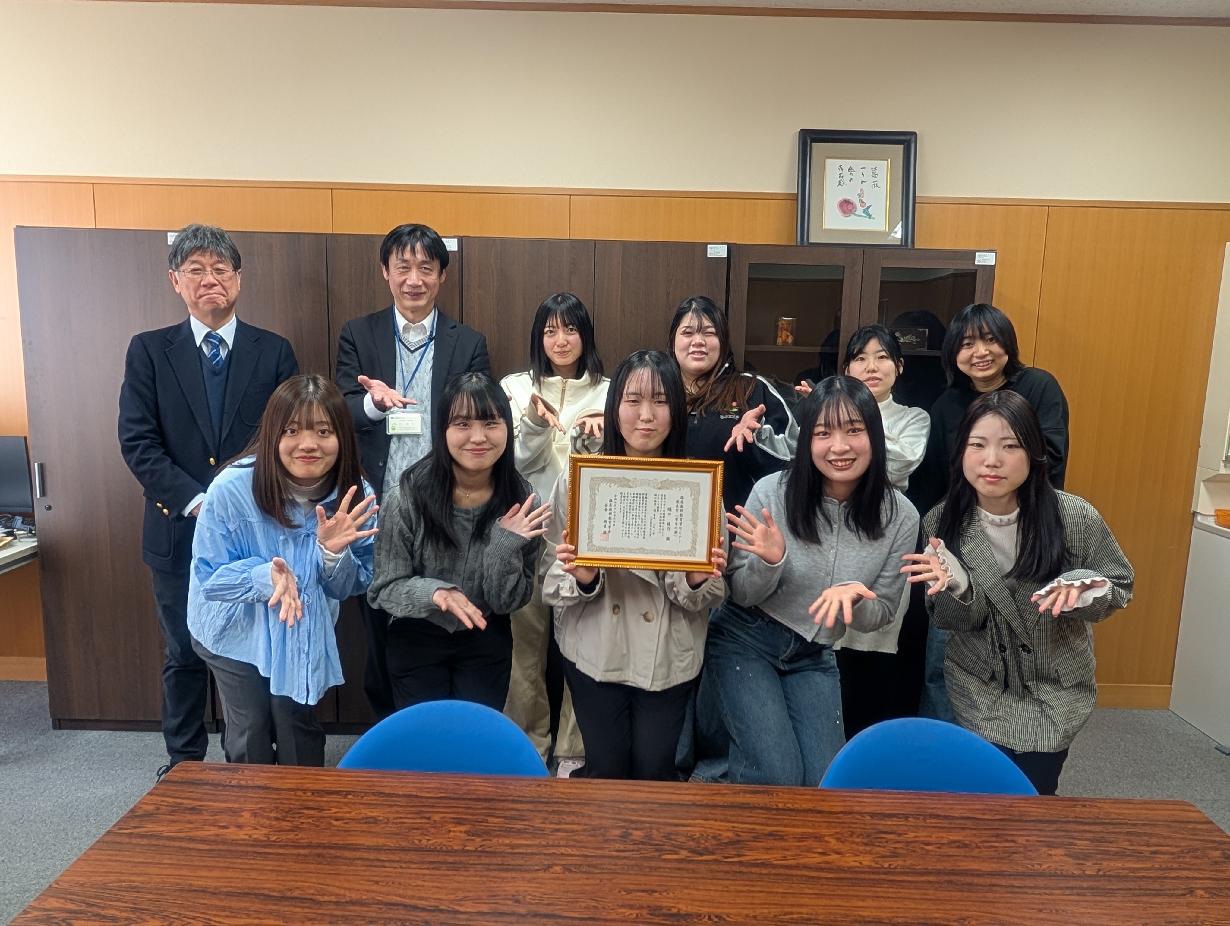 受賞した樋口綾乃さんをたたえる学生ら=甲府・飯田キャンパス