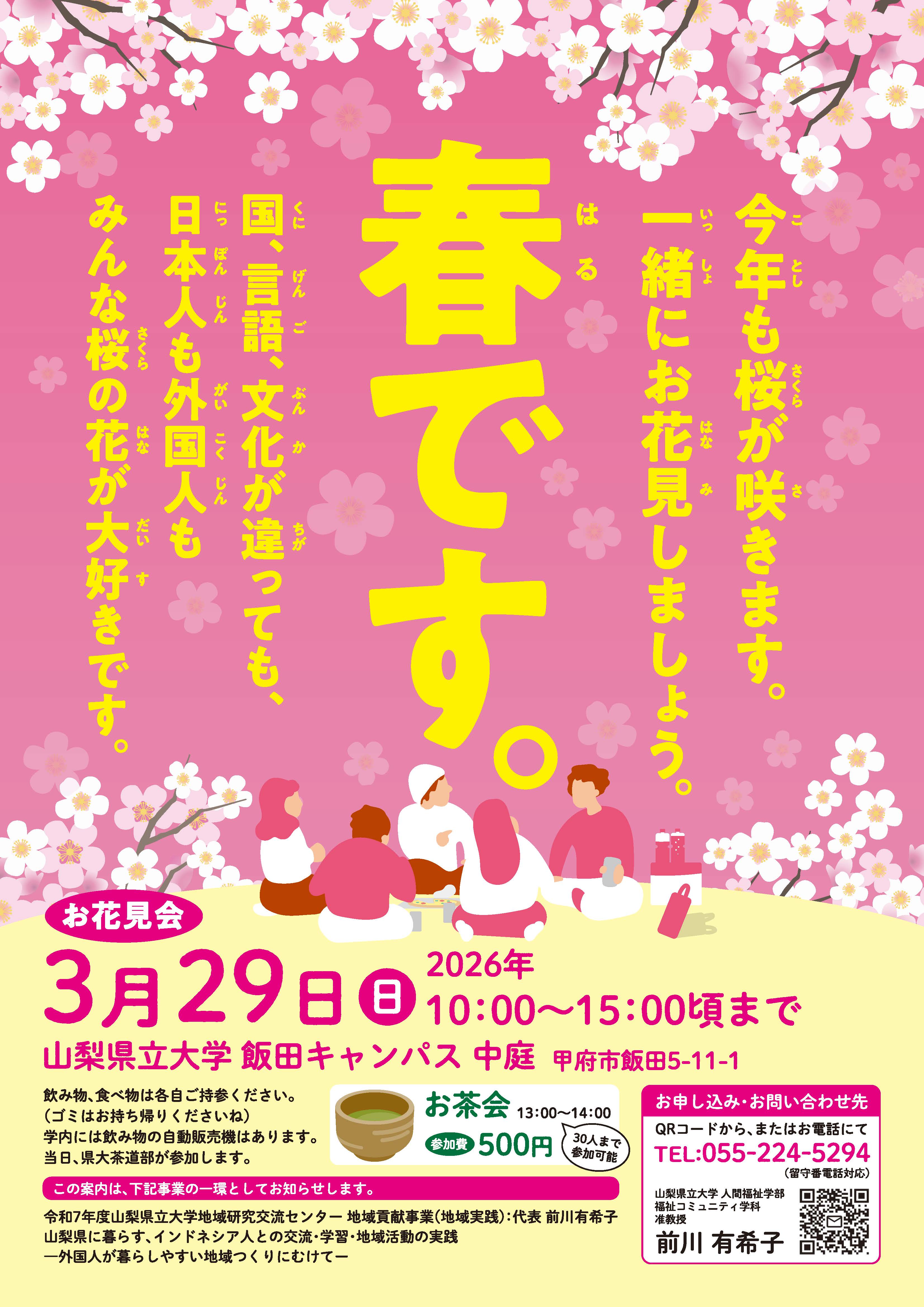 地域研究交流センターで実施している令和7年度地域貢献事業(地域実践)「山梨県に暮らす、インドネシア人との交流・学習・地域活動の実践 ―外国人が暮らしやすい地域つくりにむけて―」の活動の一環としてインドネシア交流 お花見会を3月29日(日)に開催いたします。