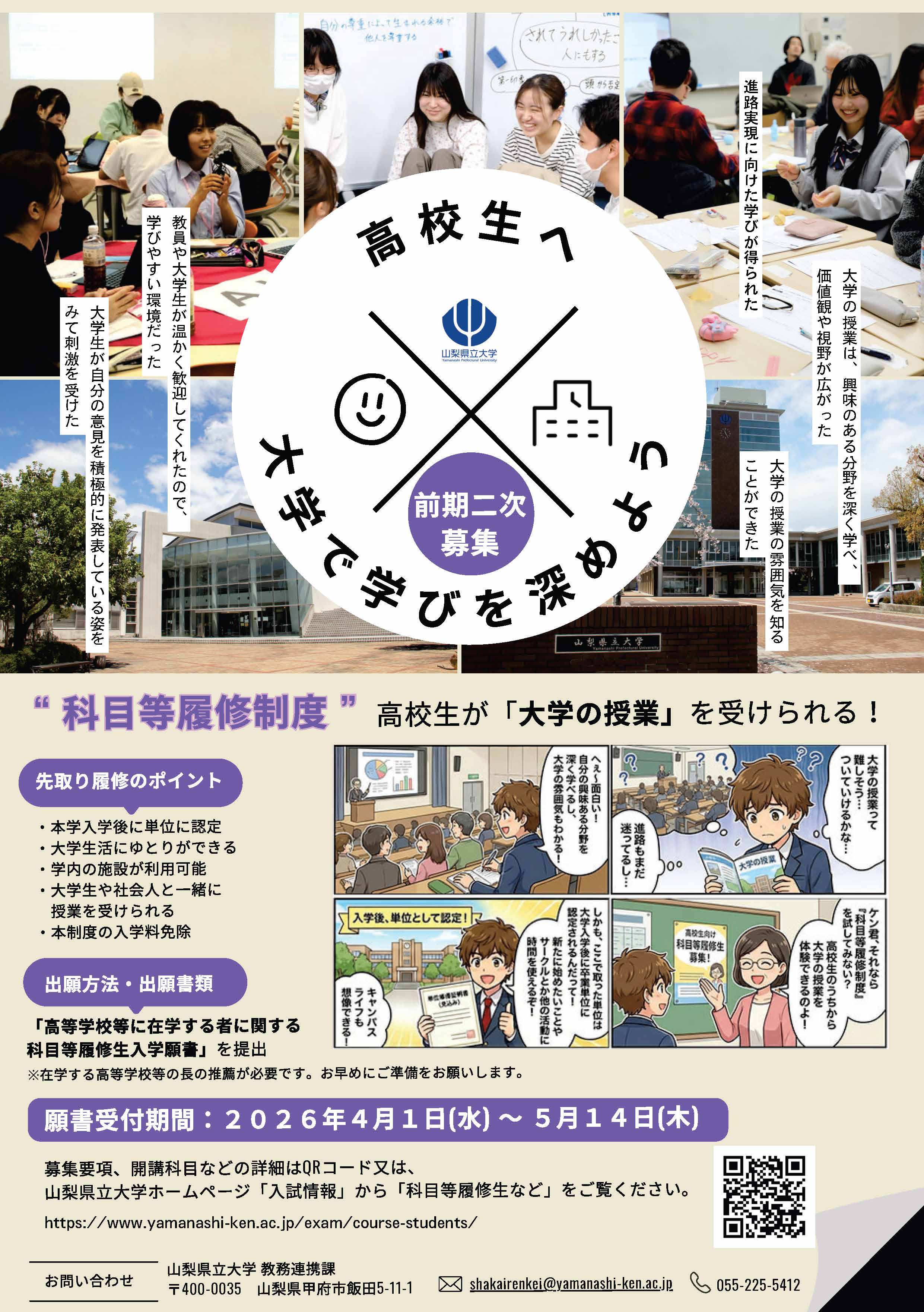 【5/14締切】令和8年度高等学校等に在学する者に関する科目等履修生(前期二次)募集要項及び出願書類(様式)について