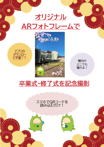 山梨県立大学では卒業式・修了式に合わせ、AR(拡張現実)技術を活用したキャンパス型フォトスポットを導入します。フォトフレームのパターンは全10種類‼ 在校生が卒業生への祝意をこめて、フレームをデザインしました。学生生活の思い出がつまったキャンパスで、たくさん撮影してください。
